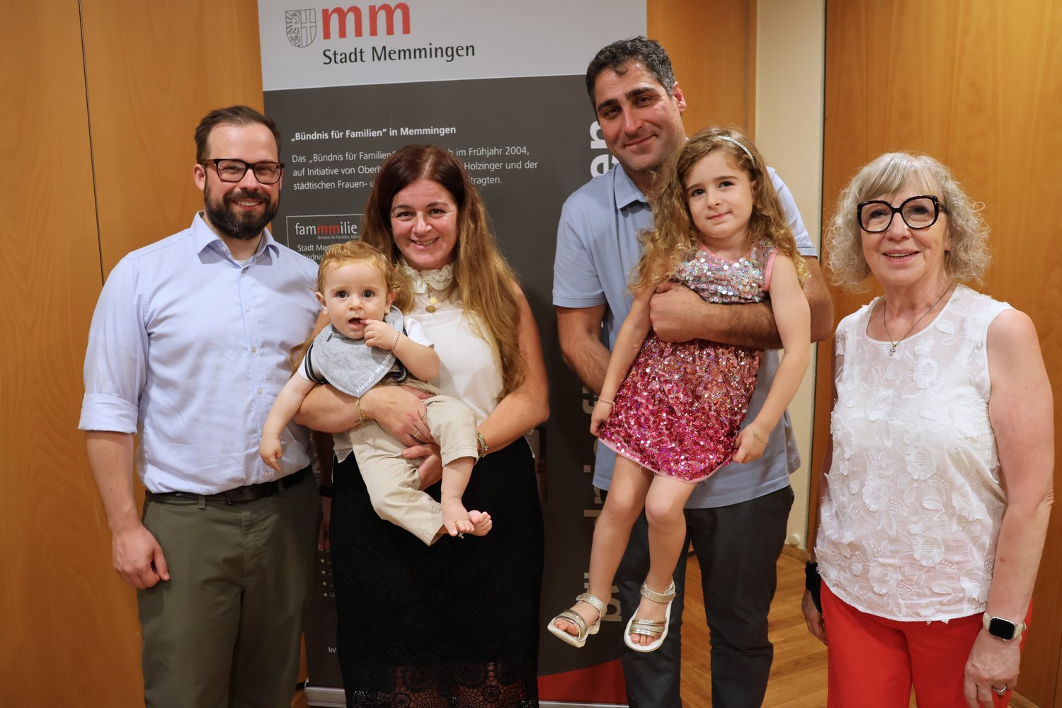 Der kleine Memminger Jeshua wurde mit seiner großen Schwester Naomi und seinen Eltern von Oberbürgermeister Jan Rothenbacher und Bürgermeisterin Margareta Böckh herzlich willkommen geheißen. Alle 54 Babys konnten sich zur Erinnerung an den schönen Nachmittag mit OB Jan Rothenbacher und Bürgermeisterin Margareta Böckh fotografieren lassen. Foto: Alexandra Wehr / Pressestelle Stadt Memmingen