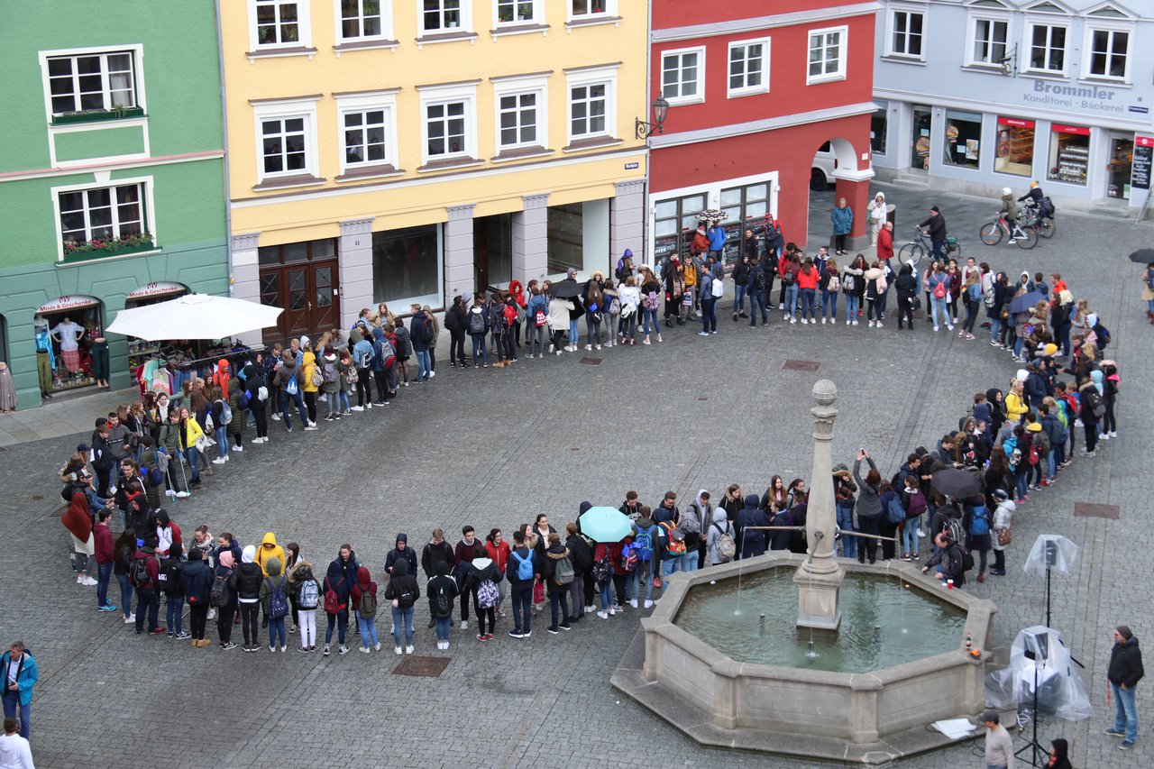 Die große „Kennenlernrunde“ der 250 Jugendlichen aus fünf europäischen Ländern auf dem Marktplatz. Foto: Manuela Frieß/Pressestelle Stadt Memmingen