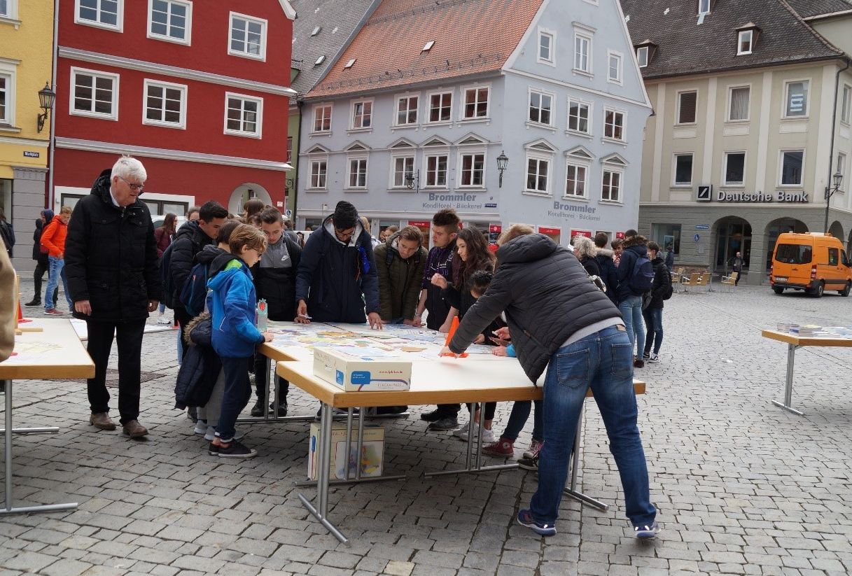 Der erste Programmpunkt für die internationalen Gäste war am Montagmorgen ein Sternmarsch auf den Marktplatz. Aus der Zangmeisterstraße, der Kalchstraße, der Fußgängerzone und vom Ulmer Tor her strömten die Jugendlichen zusammen. Auf ihrem Weg sangen die Italiener, Franzosen, Ungarn und Spanier ihre jeweilige Nationalhymne. Mit der Unterstützung einer Musikanlage wurde danach zur Europa-Hymne gewechselt, zu der die Mädchen und Jungen dann lebhaft die blau-gelben Europafähnchen schwangen. Über den Anblick freuten sich nicht nur die Memminger Passanten, sondern ganz besonders die Organisatoren wie Burkhard Arnold, der Vorsitzende der Europa Union Memmingen oder Alexandra Hartge vom Europa Büro. Im Anschluss an diesen Flashmob konnten die Schülerinnen und Schüler im Alter von 12 bis 17 Jahren an einer Stadtrally oder europäischen Stadtrundgängen teilnehmen.