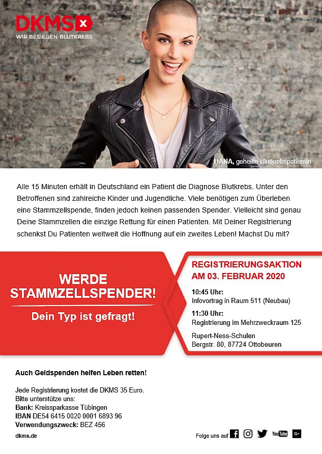 Ottobeuren/Memmingen (dl/as). Alle 15 Minuten wird in Deutschland ein Mensch mit der schockierenden Diagnose Blutkrebs konfrontiert. Darunter viele Kinder und Jugendliche. Jeder Zehnte findet keinen Spender. Deshalb laden die Rupert-Ness-Schulen im Rahmen der Aktion '5forLIFE' am Montag, 3. Februar, von 10.45 bis 13 Uhr zu einer Stammzellen-Registrierung in den Rupert-Ness-Schulen Ottobeuren ein. Die Registrierung in Memmingen findet am 17. März ab 10 Uhr in der Stadthalle statt und ist ausschließlich Schülern geöffnet.