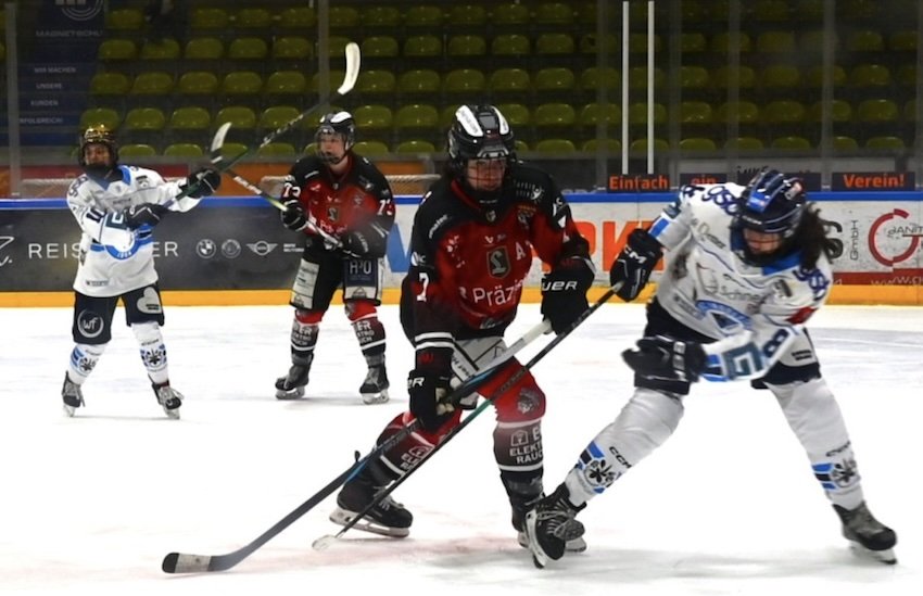 Im Play-Off-Halbfinale der blossom-ic DFEL (Fraueneishockey-Bundesliga) treffen die ECDC-Frauen auf Ingolstadt. Das Bild entstand in einer früheren Partie gegen die Oberbayerinnen. Foto: Charly Perzl ©