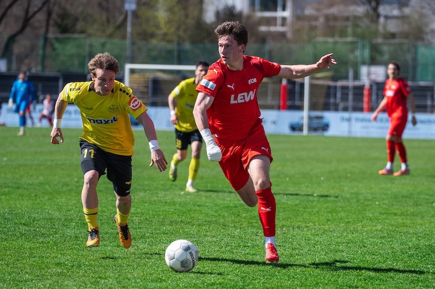 Timo Schmidt (in rot) läuft hier zwar seinem Gegenspieler davon, letztendlich behielt die SpVgg Bayreuth mit dem 3:1-Sieg alle Punkte bei sich. Foto: Hannah Brenner
