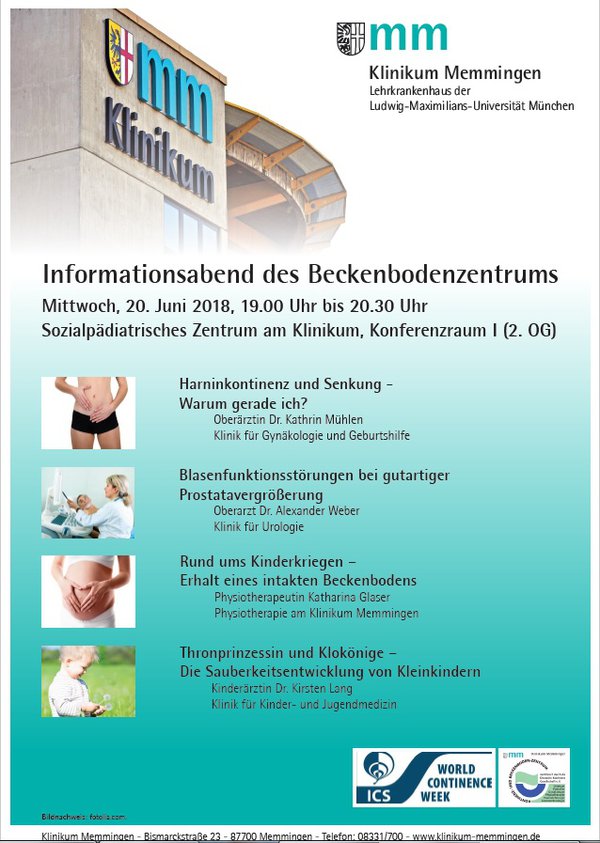 Memmingen (dl). Am Mittwoch, 20. Juni, bietet das zertifizierte Beckenbodenzentrum am Klinikum Memmingen im Rahmen der Veranstaltungsreihe "Gesundheitsakademie" eine kostenlose Informationsveranstaltung für Patienten, Angehörige und Interessierte an zum Thema „Beckenbodenschwäche und Inkontinenz“.