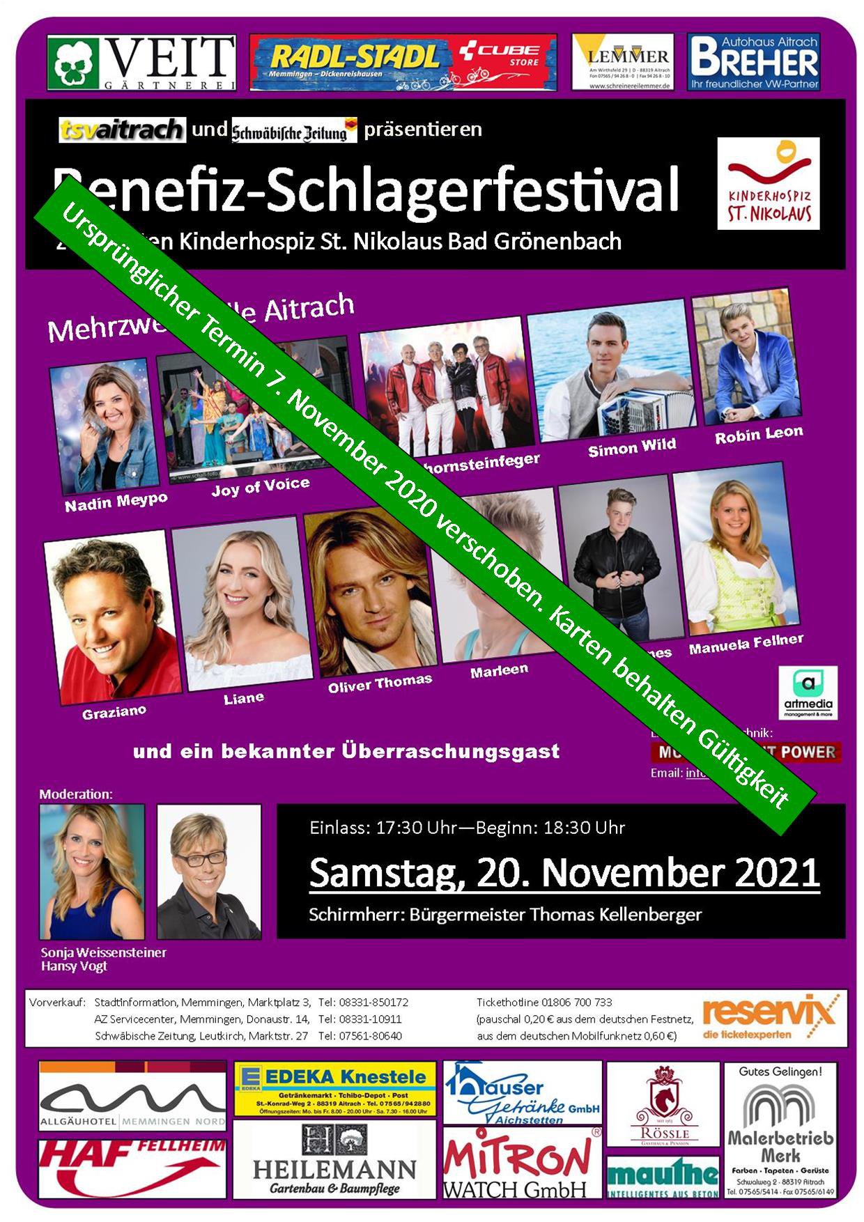 Memmingen (dl). Das für den Samstag, 7. November 2020, geplante Benefiz-Schlagerfestival in Aitrach wird abgesagt und aufs nächste Jahr verschoben. Der Ersatztermin steht mit Samstag, 20. November 2021, bereits fest.