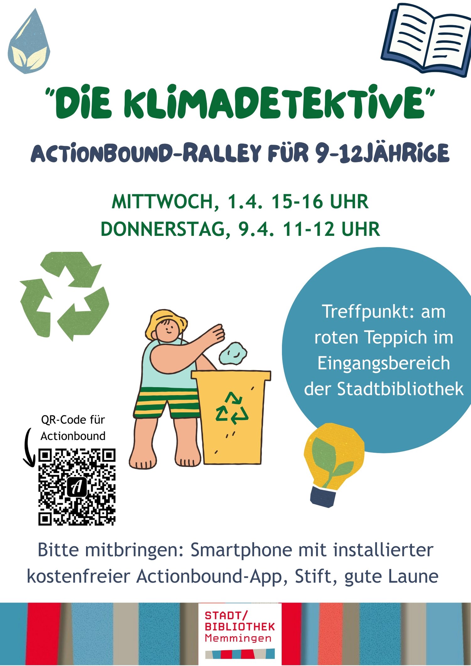 Für Kinder im Alter von 9 bis 12 Jahren organisiert die Stadtbibliothek eine spannende Rallye durch die Bibliothek. Bei der Actionbound-Rallye „Die Klimadetektive“ helfen die Teilnehmenden den Figuren Noah, Emily und Louisa, den geheimnisvollen Absender eines mysteriösen Zettels zu finden.