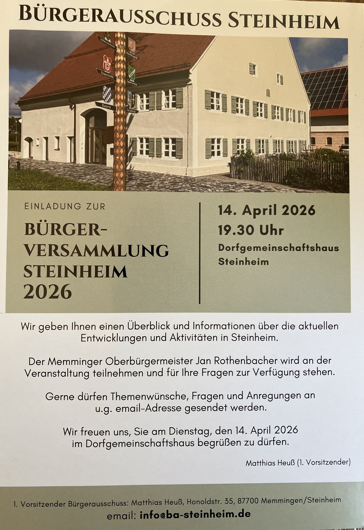 Themenwünsche, Fragen und Anregungen können per Mail an den 1. Vorsitzenden des Bürgerausschusses, Matthias Heuß, unter info@ba-steinheim.de gesendet werden.