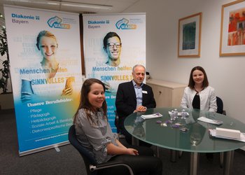 Bewerbungsgespräch“. Unser Vorschaubild zeigt zwei junge Mitarbeiterinnen der VR-Bank, die zu Gesprächen mit den Besuchern bereit standen. Fotos: Sonnleitner