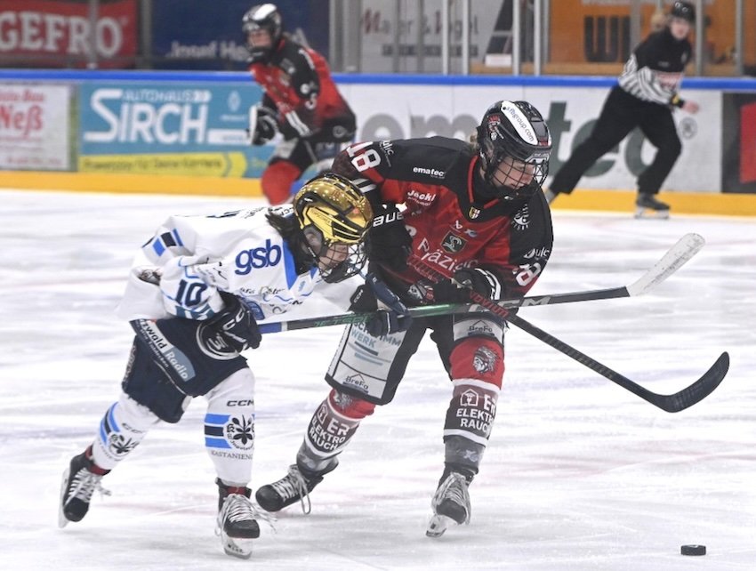 Die Eishockey-Frauen des ECDC Memmingen (in rot) haben das Tor zum Finale um die Deutsche Meisterschaft mit zwei Siegen am Wochenende ganz weit aufgestoßen. Foto: Charly Perzl ©