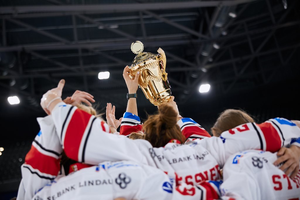 Zuletzt holten die ECDC-Frauen 2023 in Zug den Titel - hier mit dem begehrten Pokal. Foto: Valentin Studerus (EV Zug)
