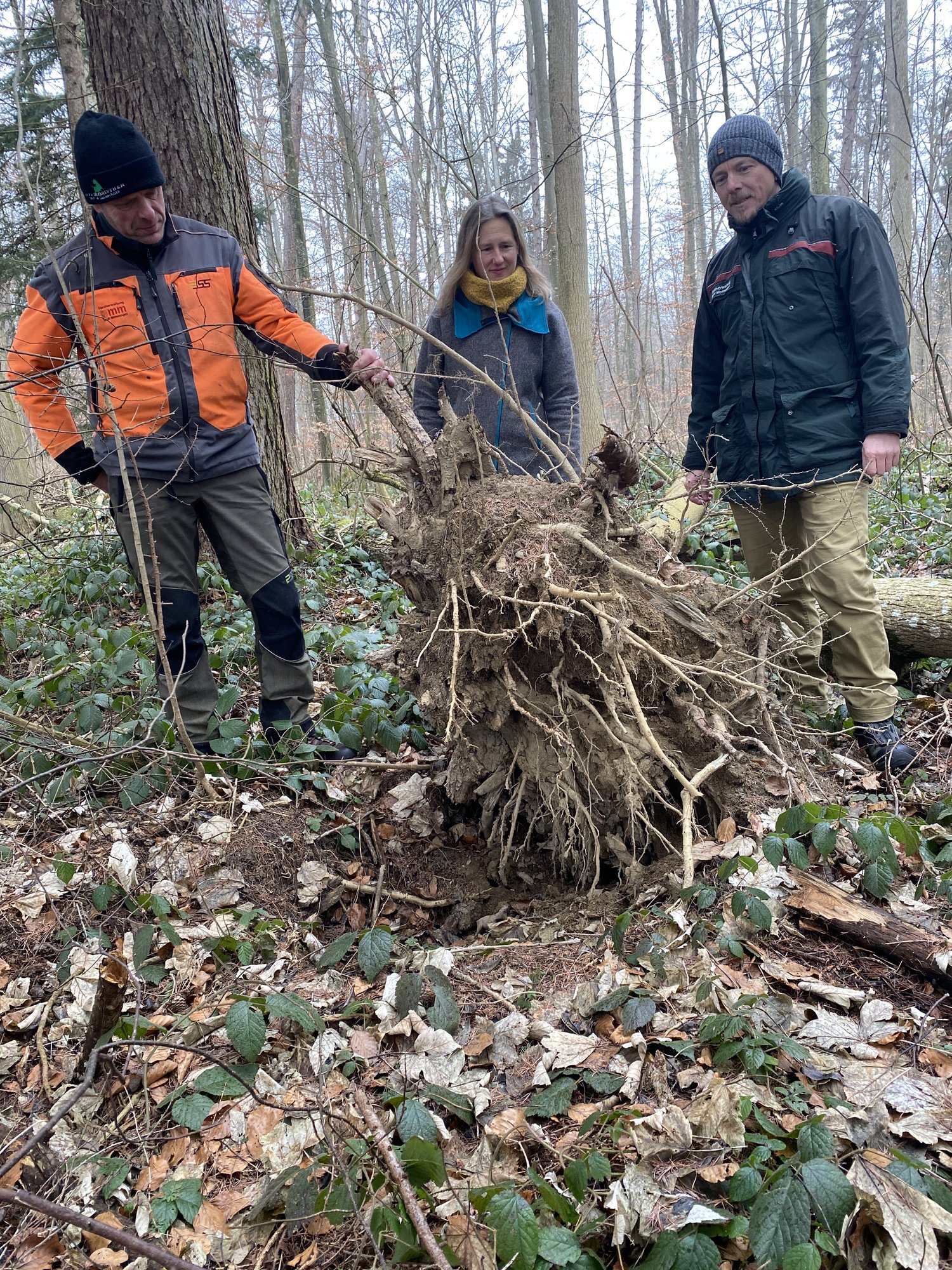 Revierförster Wolfgang Küchle (li.), Anwohnerin Susanne Manz und Forstamtsleiter Stefan Honold (re.) mit dem durch den Pilz geschädigten Wurzelballen. Foto: Manuela Frieß/ Pressestelle Stadt Memmingen