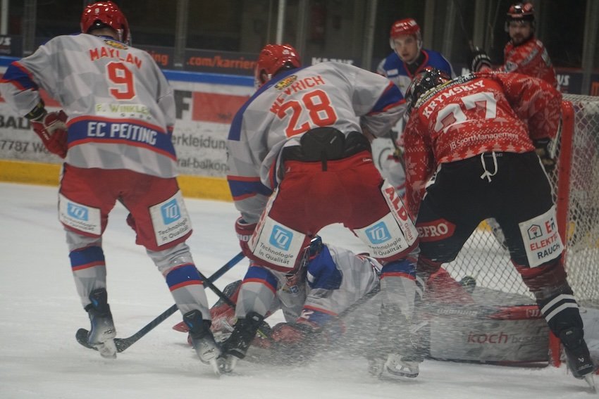 Die Memminger, hier mit Nikita Krymskiy (in rot), taten sich gegen die einsatzfreudigen Peitinger einfach schwer. Auch hier war's nix mit einem Torerfolg. Foto: Michael Geiger