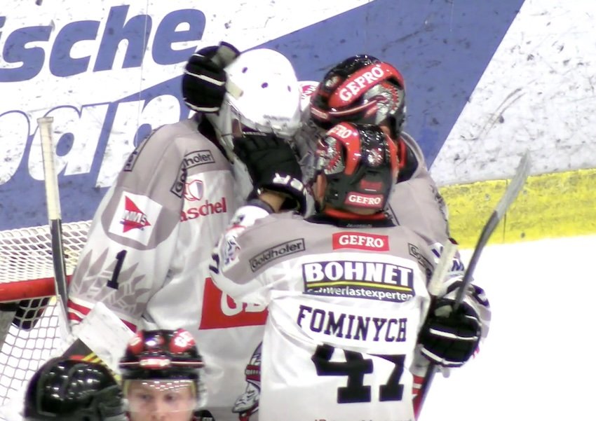 Die GEFRO-Indians feierten ihren überragenden Goalie Justus Roth (ganz links), der mit genialen Paraden maßgeblich am knappen 2:1-Sieg in Bad Tölz beteiligt war. Bildschirmfoto: sprade.tv/Wolfgang Radeck