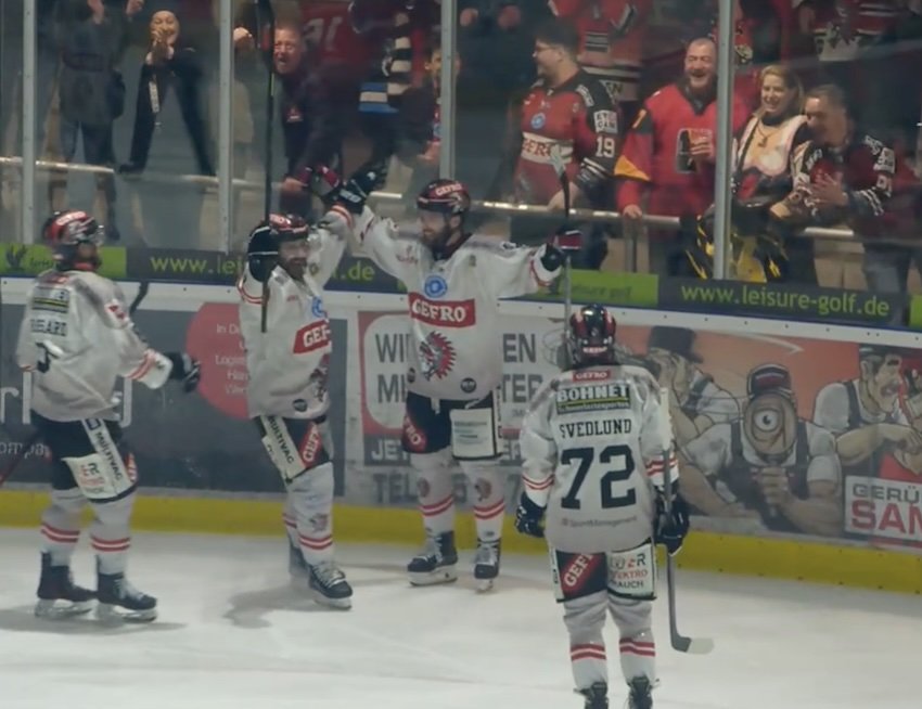 Die GEFRO-Indians bejubeln hier vor ihren mitgereisten Fans den Siegtreffer von Brett Ouderkirk. Bildschirmfoto: sprade.tv/Wolfgang Radeck