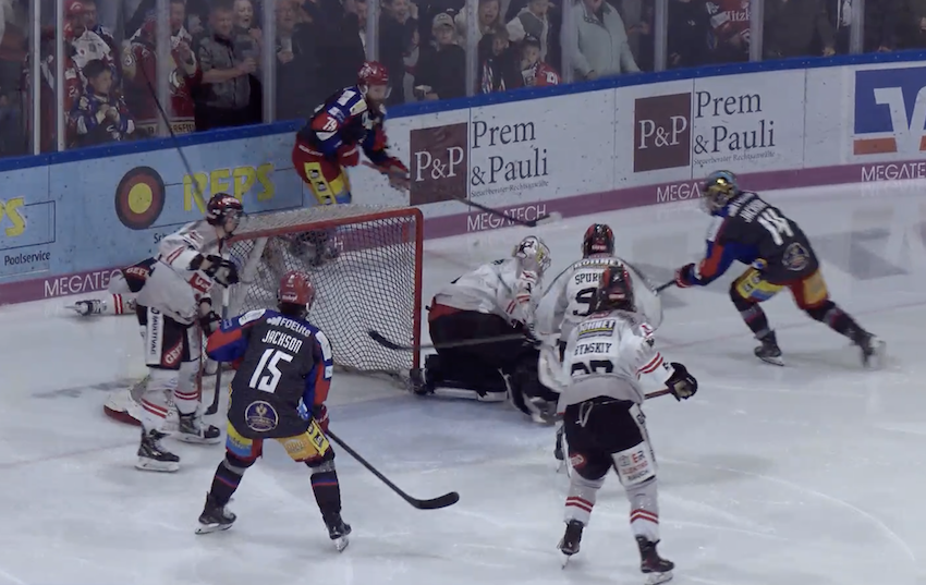 Hier kann Justus Roth mit Hilfe seiner Vorderleute einen Gegentreffer verhindern, letztendlich setzte sich Deggendorf (dunkle Trikots) aber mit 3:1 im ersten Finalspiel durch. Bildschirmfoto: sprade.tv/Wolfgang Radeck