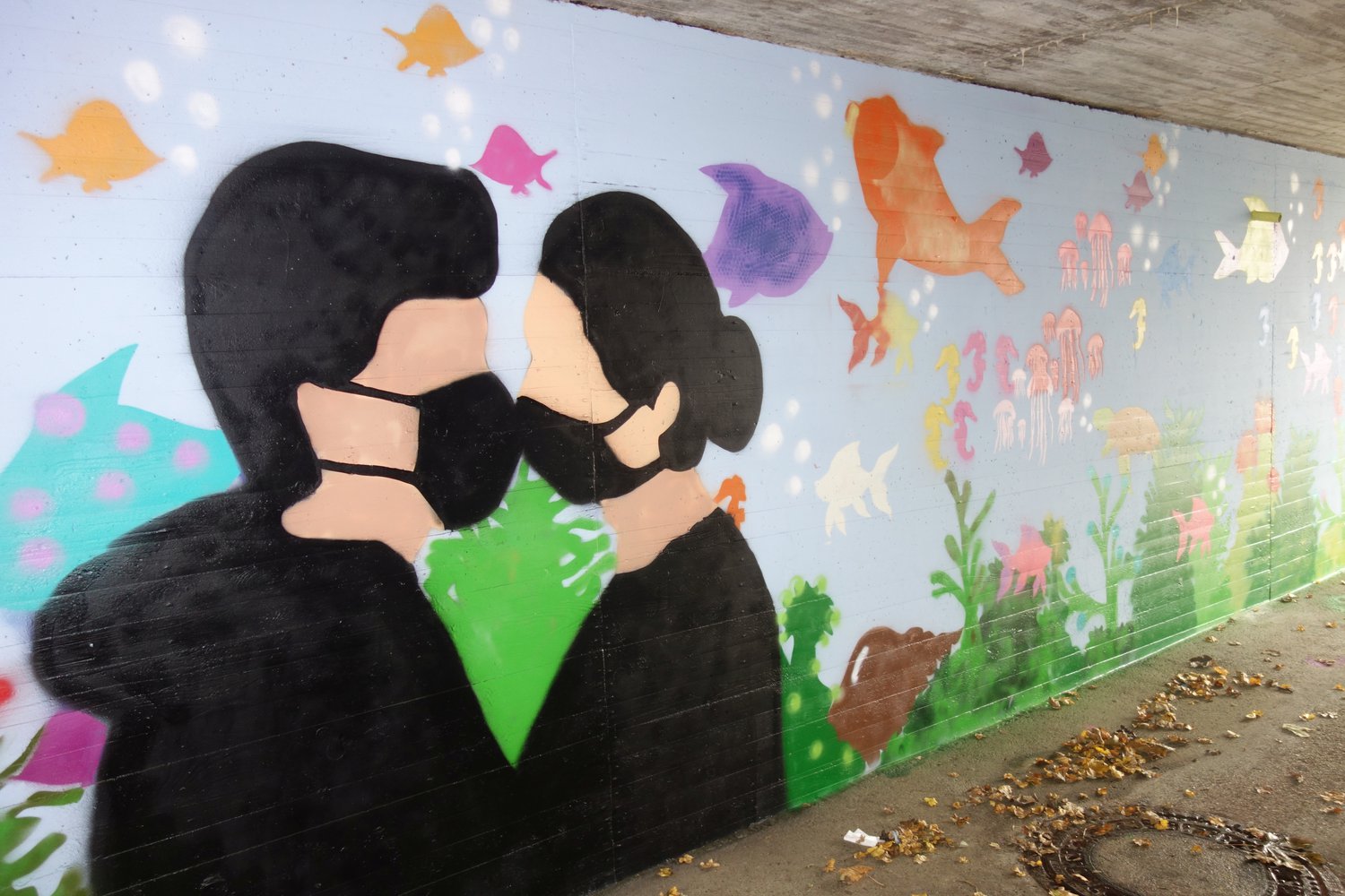 Die Ambivalenz von Trennung und Nähe ist auch eines der zentralen Motive der zweiten Schülergruppe: Zu sehen sind Paare, die das Abstandsgebot der Pandemie durchbrechen und sich mit Maske küssen. Das Geschlecht der Protagonisten ist nicht klar erkennbar – „wir wollen zeigen, dass jeder lieben darf, wen er möchte“, erläutern die Schüler ihre Absicht. Der Hintergrund zeigt ein wandfüllendes Aquarium mit Fischen in bunter Vielfalt – jeder davon einzigartig. Auch hier gilt die Maxime von Individualität und Toleranz: „Jeder darf sein, wie er ist.“ Mit der Aquariumswelt möchten die Schüler eine ruhige Atmosphäre schaffen, damit niemand im Dunkeln in der Unterführung Angst haben muss.