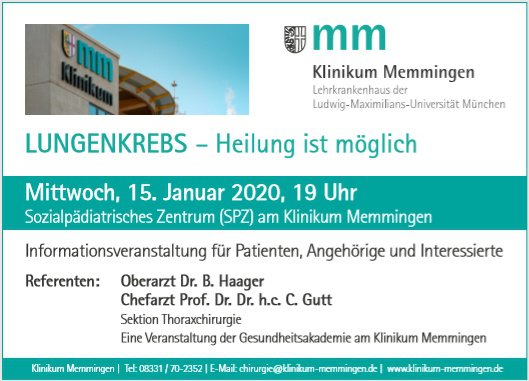 Memmingen (dl). Im Rahmen der Veranstaltungsreihe "Gesundheitsakademie" des Klinikum Memmingen bietet die Sektion Thoraxchirurgie unter Chefarzt Prof. Dr. Dr. h.c. C. Gutt am Mittwoch, 15. Dezember, ab 19 Uhr, eine kostenlose Informationsveranstaltung an zum Thema "Lungenkrebs – Heilung ist möglich".