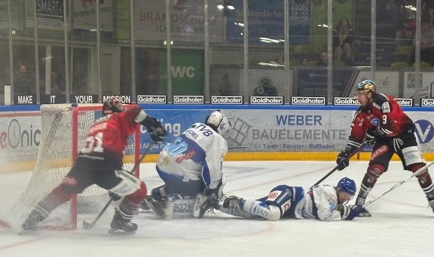 Auch wenn es in dieser Szene keinen Memminger Treffer gab, letztendlich setzten sich die GEFRO-Indians (in rot) deutlich gegen den SC Rießersee durch. Foto: Michael Geiger