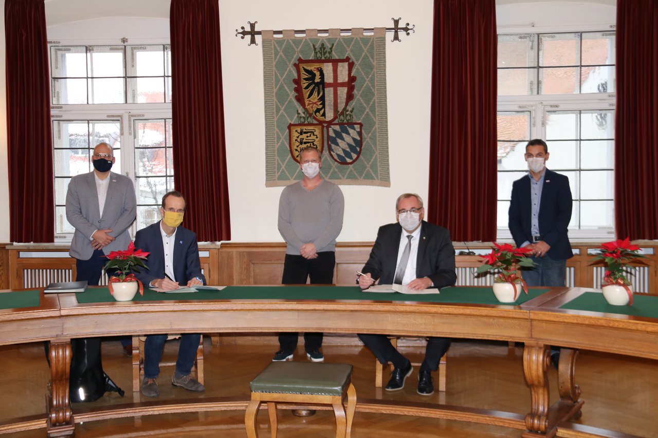 Bei der Vertragsunterzeichnung im Rathaus: (von links): Stadtkämmerer Gunther Füßle, Martin Sambale, Geschäftsführer der eza!, Energiemanager Mario Hönisch, Oberbürgermeister Manfred Schilder und Fabian Damm, Leiter des Baureferats. Foto: Manuela Frieß/ Pressestelle Stadt Memmingen