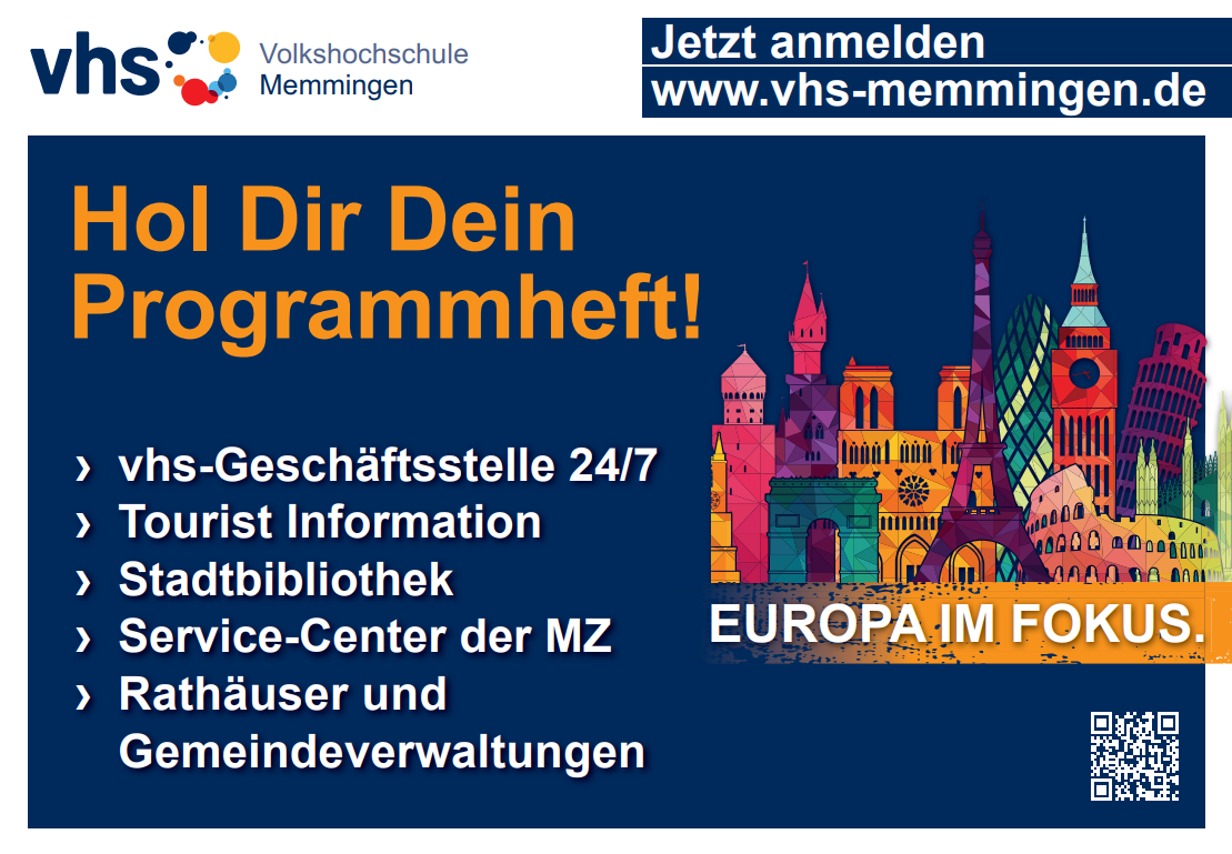 Das gedruckte Programmheft gibt es ab dem 10. Januar in der Geschäftsstelle der vhs Memmingen sowie bei der Tourist Information, der Stadtbibliothek und in vielen öffentlichen Gebäuden.