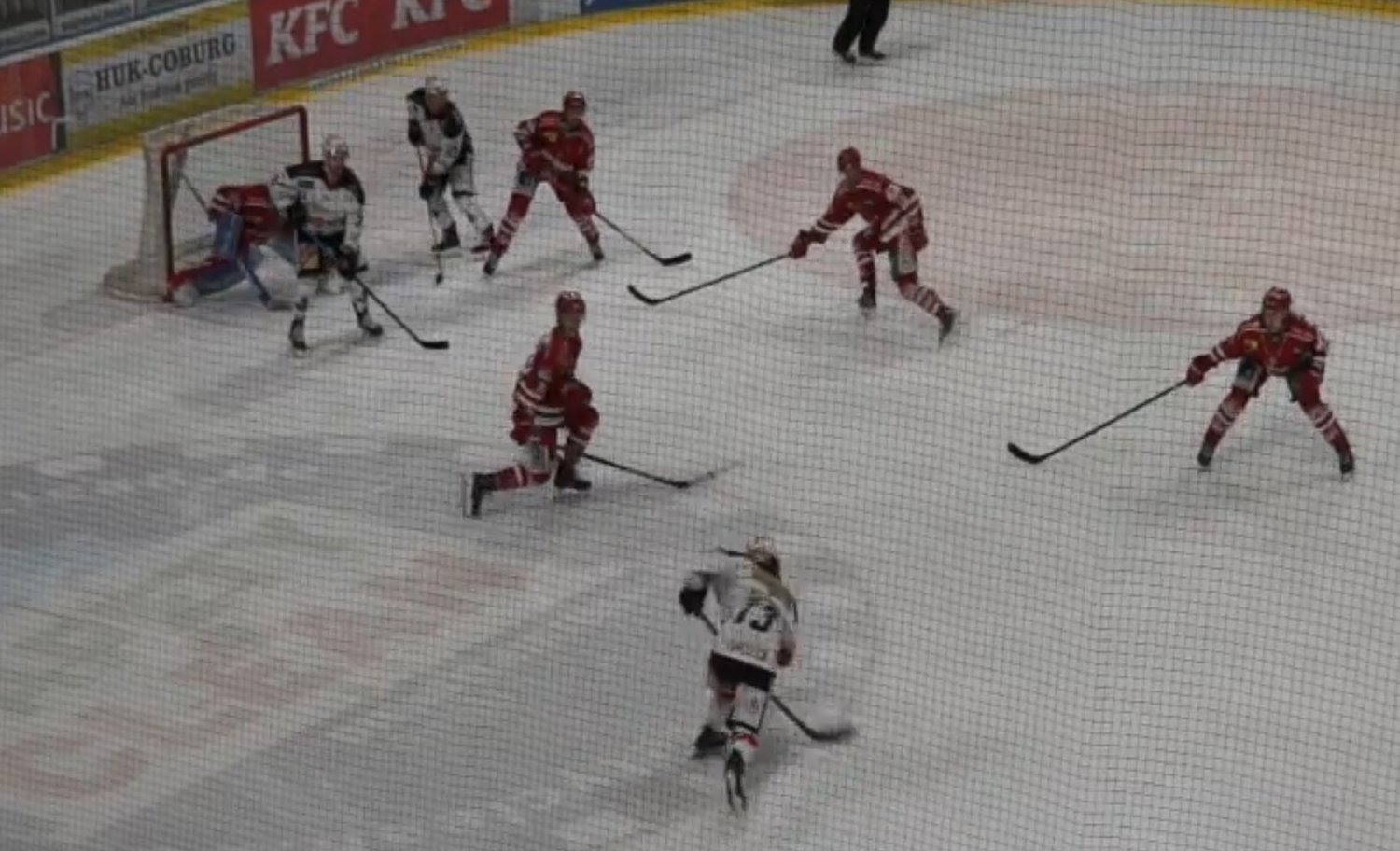 Der Versuch von Marvin Schmid (Nr. 13, weißes Trikot) wurde geblockt, das mögliche 2:0 wollte nicht gelingen. Dafür drehte Regensburg in der Schlußphase die Partie und schickte die Indians ohne Punkte nach Hause. Foto: Radeck/Bildschirmfoto Sprade.TV