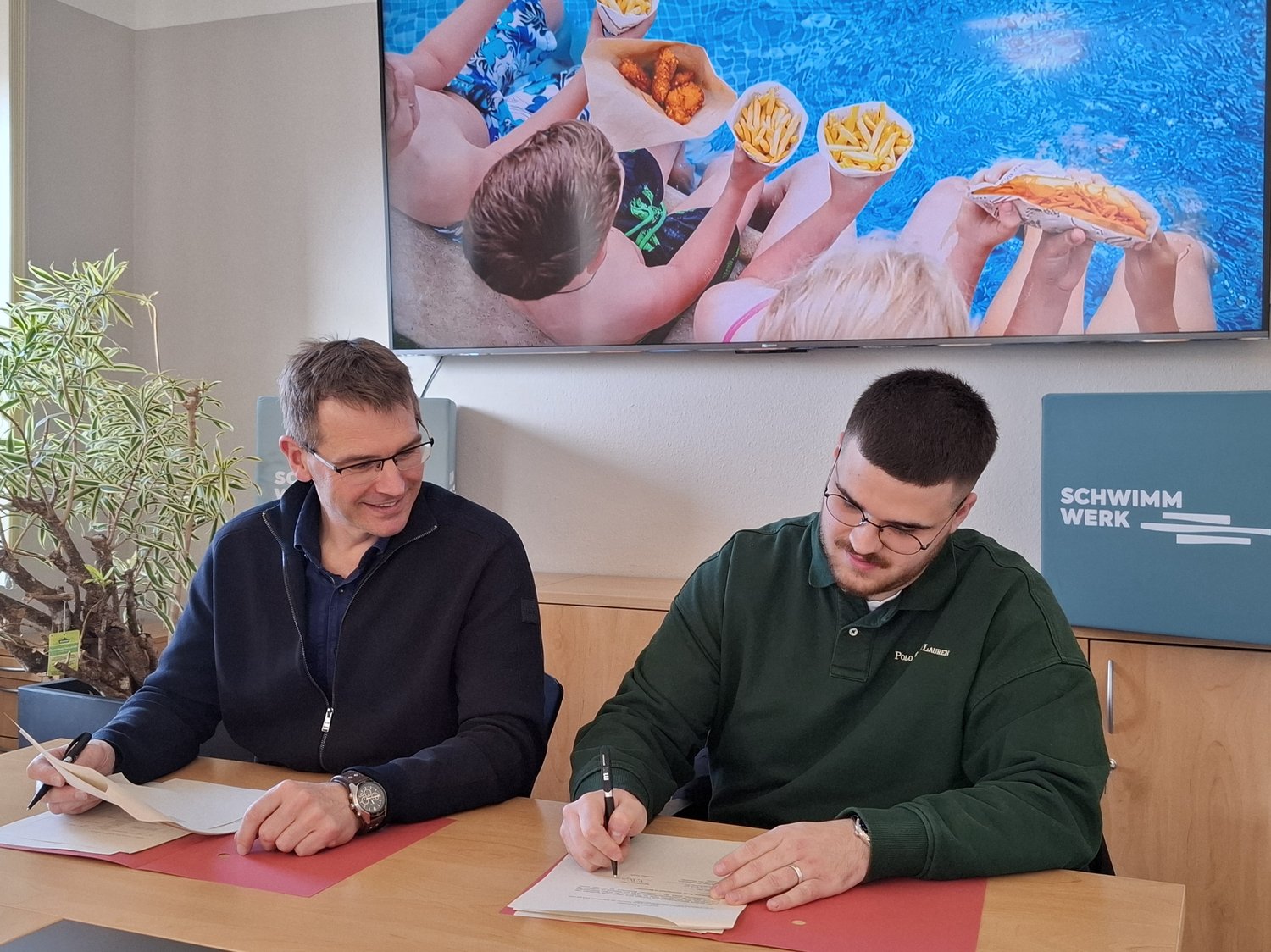 Marcus Geske (links), Leiter der Stadtwerke, und Florian Bajrami, der neue Pächter des Freibadkiosks im Schwimmwerk, bei der Vertragsunterzeichnung. Foto: Stadtwerke Memmingen