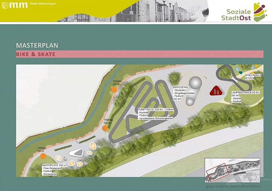 Memmingen (as). Nachdem die Mitglieder des Bauausschusses dem Konzept einhellig zugestimmt haben, wurde der Masterplan für das Gesamtkonzept „Bike- und Skatepark sowie Spiel-, Jogging- und Spazierrundweg Haienbach“ auf dem bislang als landwirtschaftliche Fläche genutzten Areal zwischen dem Tiroler Ring und dem Haienbach nun in einer digitalen Informationsveranstaltung präsentiert. Mit dem Freizeitpark als Treffpunkt für alle Generationen wird der Memminger Osten deutlich aufgewertet.