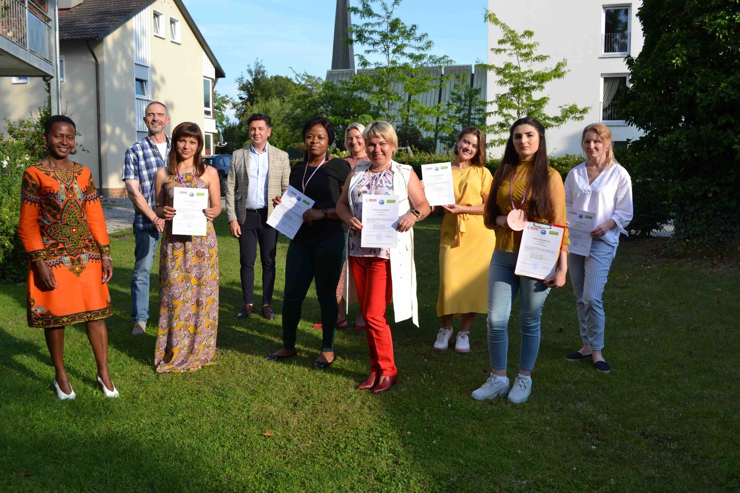 Der Elternkurs (von links): Bridget Juma (Caritas Migrationsdienst, Kooperation im MIG), Alexander Mück (Leiter Bildungs-und Freizeiteinrichtungen, Stadtjugendamt MM), Elisabeth Keller, Jurij Borodkin, Stella Ohaebo, Ilona Natterer, Olga Lammok, Anastasia Tokareva, Hivin Bairam, Viktoria Eichhorst. Foto: Stadtjugendring Memmingen
