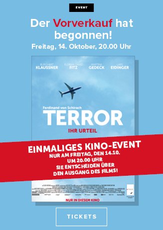 Memmingen (dl). Am Freitag, 14. Oktober, 20 Uhr zeigt das Memminger Cineplex den deutschen Film „Terror - Ihr Urteil“. Das Besondere daran: Der Zuschauer trifft die Entscheidung über den Ausgang des Films!