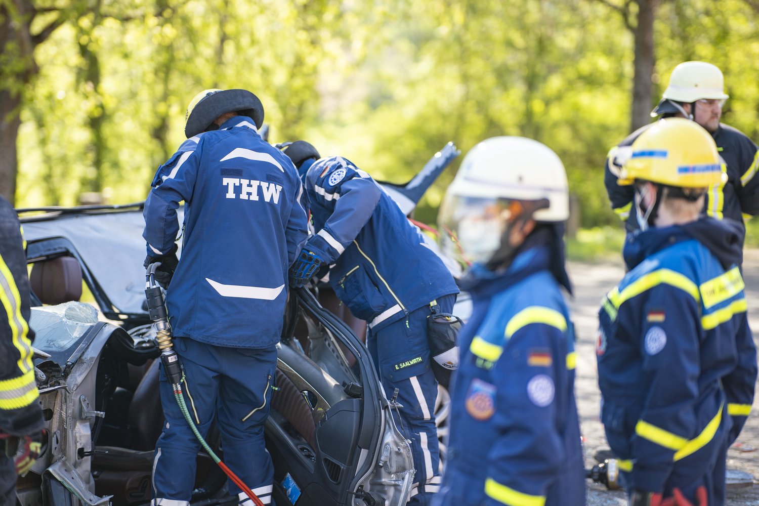 Am zweiten Übungstag standen zunächst verschiedene Ausbildungsstationen auf dem Programm, etwa Rettungsübungen aus Höhen und Tiefen, Erste-Hilfe-Maßnahmen sowie Trainings für Atemschutz und technische Hilfeleistung. Anschließend folgte eine weitere anspruchsvolle Übungsphase mit mehreren parallelen Schadenslagen: Dazu gehörten ein abgestürztes Fahrzeug in einer Kiesgrube, ein Garagenbrand mit vermissten Personen sowie eine Explosion auf einer Baustelle mit verschütteten Personen. Ergänzend mussten unter anderem eine Person aus einem Gewässer gerettet sowie ein Maschinenunfall und ein Fahrzeugbrand bewältigt werden.