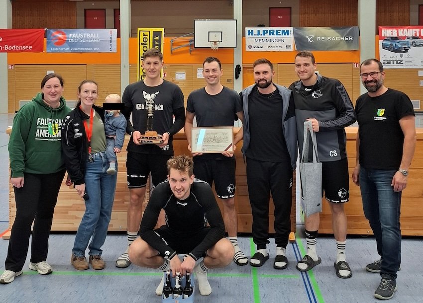 Der Bundesligist TV Neugablonz hat erneut den Allgäu Faustball Cup des SV Amendingen gewonnen. Das Team wird hier eingerahmt von (von links) Eva Müller (Stv.Abteilungsleiterin), Alex Prem (Abteilungsleiterin) und Frank Holzheu (ganz rechts). Foto: Lukas Mang/SVA-Faustball