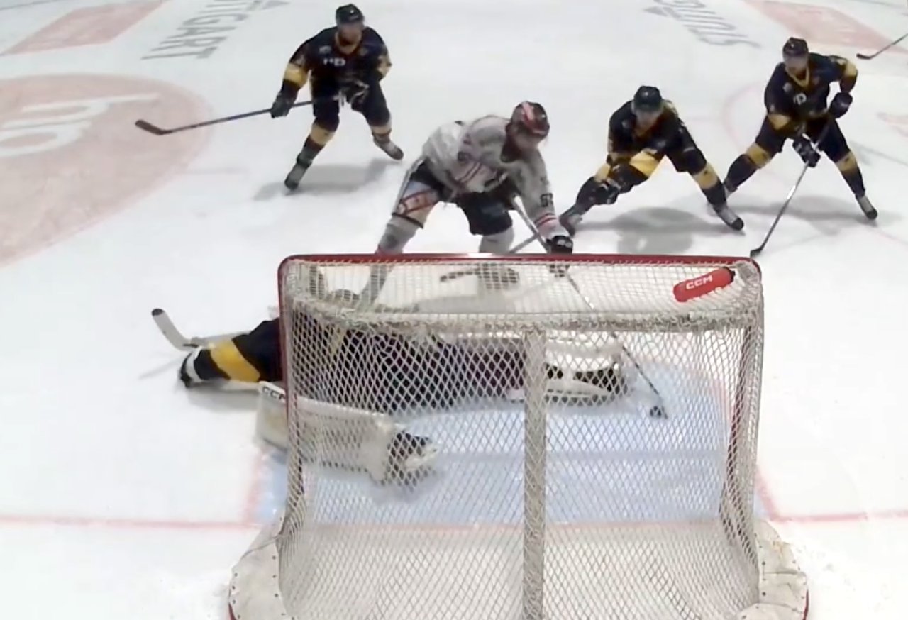 Tobi Meier (Bildmitte im weißen Trikot) zeigt sich hier total abgezockt und umkurvt Torhüter Jonas Gähr, ehe er den Puck zur 1:0-Führung ins Stuttgarter Gehäuse schiebt. Bildschirmfoto: Wolfgang Radeck/sprade.tv