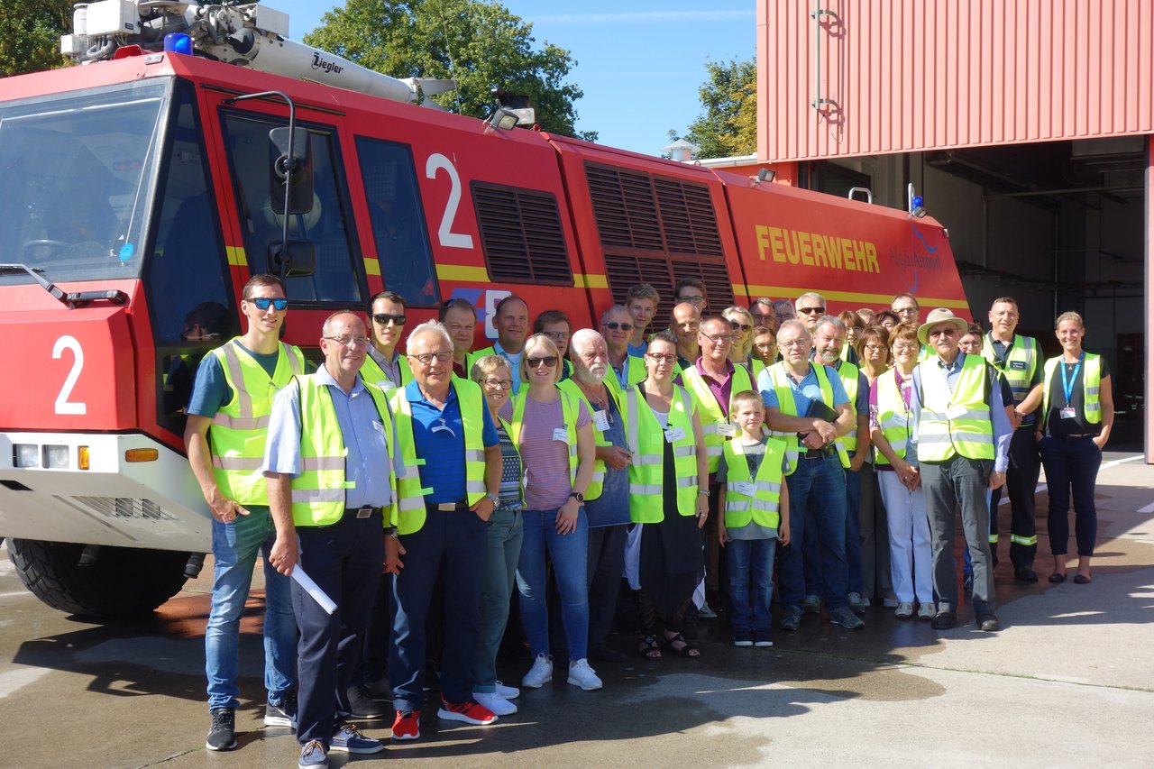 Katrin Ettmüller (rechts) vom Flughafen-Marketing führte eine große Gruppe über das Airport -Gelände und machte dabei Station bei der Flughafen-Feuerwehr. Neben ihr , steht Feuerwehrmann Wolfgang Grabmaier. Links vorne im Bild ein Kenner des Flughafens: Peter Wassermann, Major der Reserve. Fotos und Galerie: A. Sonnleitner