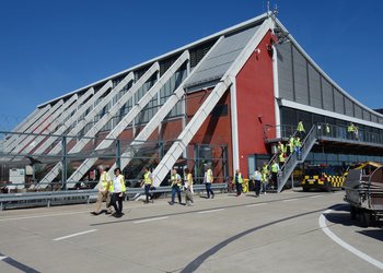 Katrin Ettmüller begann ihre Führung mit einem Streifzug durch die Geschichte des Allgäu Airport von seinem Bau als Militärflughafen im Jahr 1935 über den Umbau zum Passagierflughafen 2006 bis zur Feier des einmillionsten Passagiers im letzten Jahr.