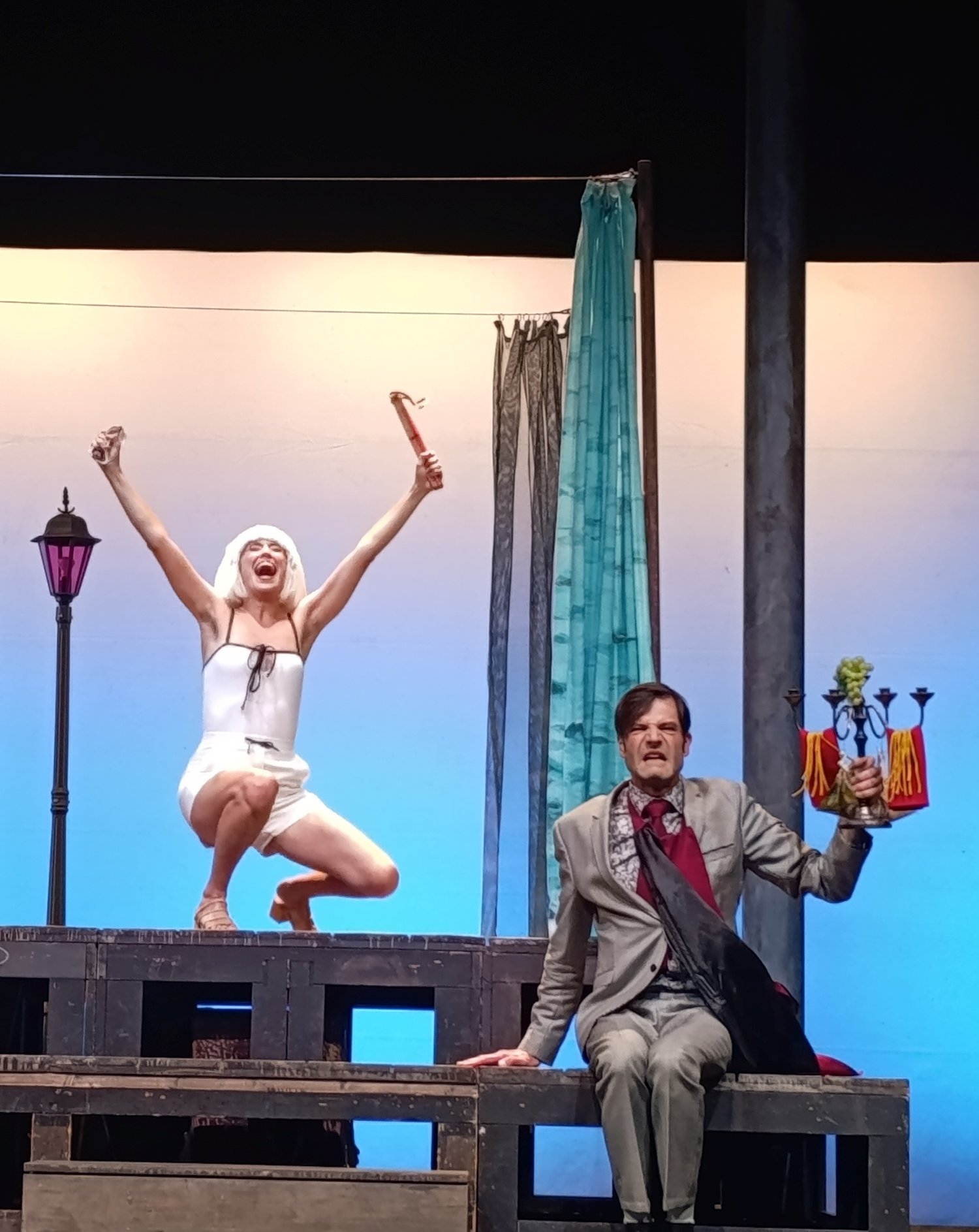 Clarice Pantalone (Roberta Monção) und die verkleidete Beatrice (Delia Rachel Bauen) als vermeintliches Brautpaar.