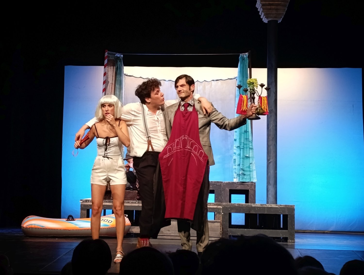 Masken, Fächer, Lampions und ein Schlauboot statt Gondeln - eine Säule mit dem gefiederten Löwen deutet den Markusplatz an, ein Holzsteg mit Gaze-Vorgang die berühmte Rialtobrücke. Dazu ertönen italienische Urlaubsschlager wie „Azzurro“, „Buona Sera, Signorina“ und „Volare“. Das Bühnenbild von Monika Gora bedient lustvoll und ironisch alle Venedig-Klischee und legt in den Partyszenen der Liebenden Silvio Lombardi und Clarice Pantalone noch eine Prise 70er Jahre-Discoflair obendrauf.
